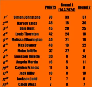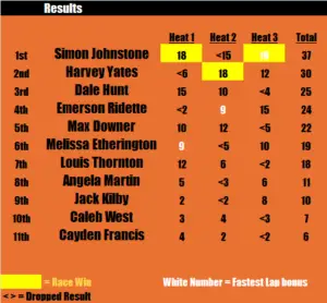 3rd: Dale Hunt achieved a 2nd and 4th place finish to end up 3rd in the table for Round 2. After a tense battle with Louis throughout Heat 1, Dale finally managed to make an overtake on the last lap to take the 2nd place finish in the Heat.