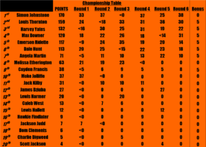 Louis Thornton agonizingly lost out on top spot in the final round of the championship. However he still finished in second with a massive points tally of 159. Louis achieved a top 3 finish in 5 out of the 6 rounds he competed in including a victory in round 5, very impressive consistency.