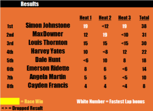 Race 1: 1st. Simon Johnstone 2nd. Louis Thornton 3rd. Max Downer 4th. Harvey Yates