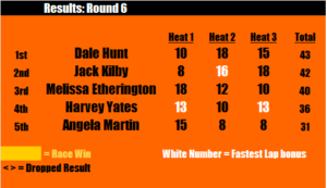 1st: Dale Hunt – In an extremely close field of drivers, it was Dale Hunt who finally claimed his first Round victory of the Series. Dale claimed a 4th, 2nd and 1st place in his 3 races which was enough to propel him to the top step of the podium, finishing with a final points total of 43. Congratulations Dale!
